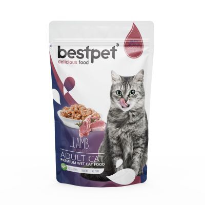 Корм полнорационный консервированный для взрослых кошек. Кусочки в желе с ягненком.