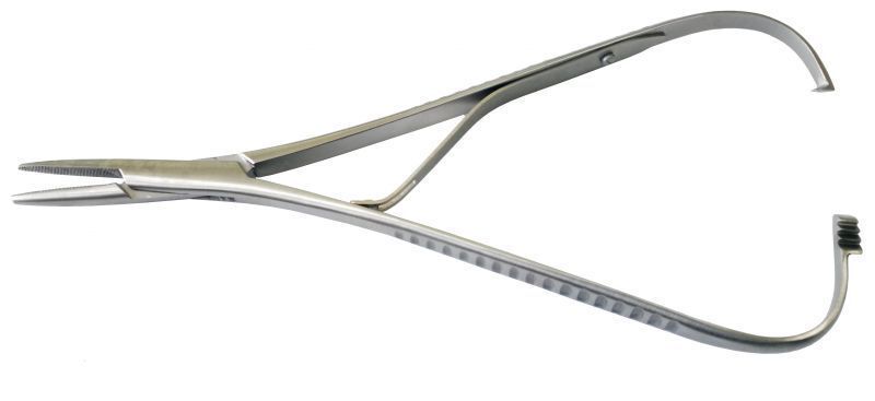 Иглодержатель по Матье (Mathieu).Needle holder MathieuИглодержатель по Матье предназначен для проведения хирургической иглы через ткани при наложении швов.Он снабжен пружинистыми рукоятками и кремальерным замком, который размыкается при дальнейшем сжатии рукоятки.Длина 140 мм