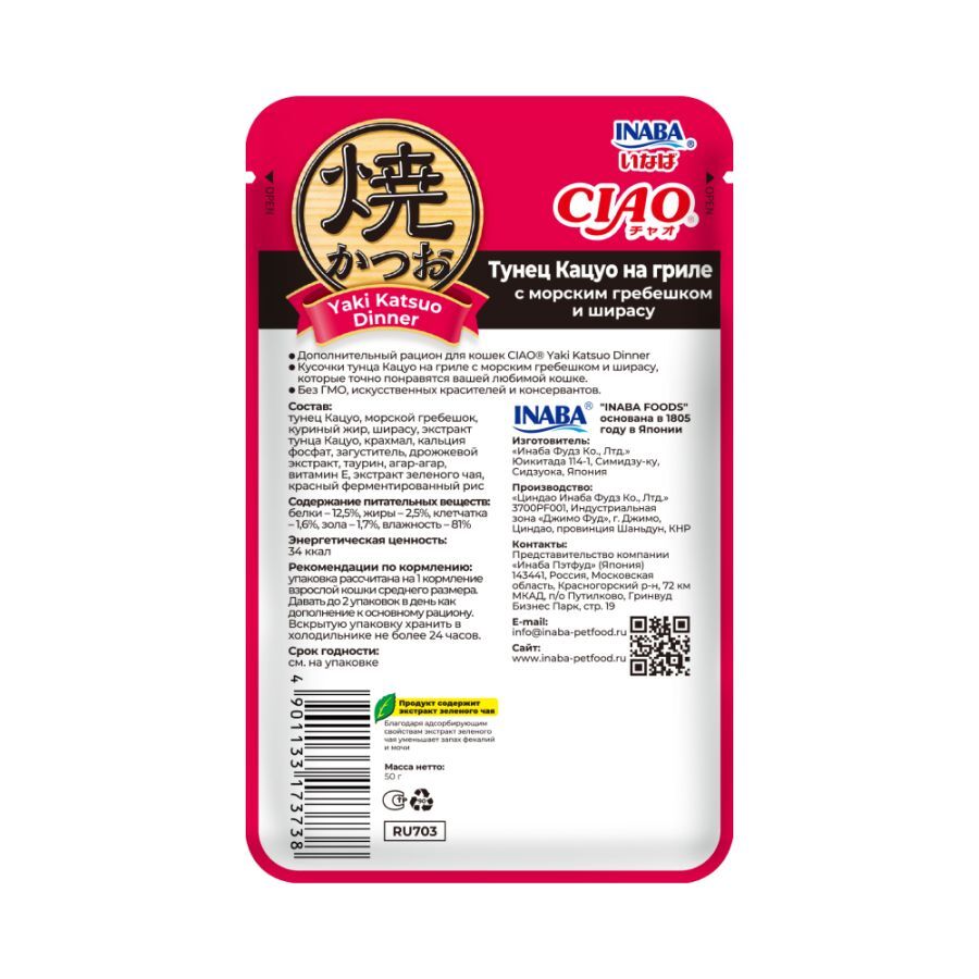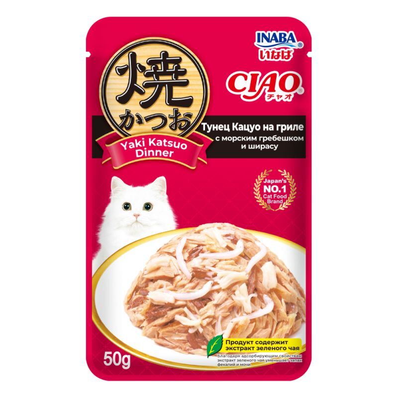 Суперпремиальный влажный корм для кошек CIAO Yaki Katsuo Dinner (ЧАО ЯКИ КАЦУО ДИННЕР) от японского производителя Inaba приготовлен на основе тунца Кацуо, приготовленного на гриле, с добавлением морского гребешка и мальками ширасу. Аромат и вкус данного корма не оставит равнодушной ни одну кошку. Корма и лакомства Inaba отличаются высоким качеством и неповторимым вкусом, ведь они изготавливаются на основе отборных традиционных японских ингредиентов! Во все продукты добавлен экстракт зеленого чая, который, благодаря содержанию катехина, обладает нейтрализующим действием на запах содержимого кишечника. Корм обогащён витамином Е - натуральным антиоксидантом, поддерживающим иммунную систему, не содержит искусственных добавок, красителей и консервантов.