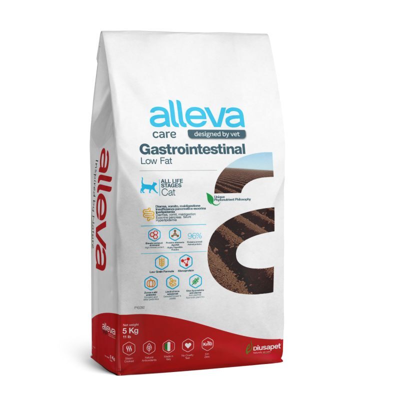 Alleva Care Gastrointestinal Low Fat - это высоко усваиваемый рацион с низким содержанием жиров, повышенным содержанием натрия и калия, с отборной растворимой клетчаткой (тыква, подорожник, ксилоолигосахариды (X.O.S)) и другими пребиотиками. В состав корма входит комплекс растительных компонентов - фитонутриентов, полезных для нормализации процессов пищеварения и улучшения здоровья кишечника, а также комбинация трех различных штаммов тщательно отобранных и очищенных дрожжей, которые отвечают за стимуляцию иммунной системы в борьбе с патогенами и за восстановление оптимальной работы кишечника.