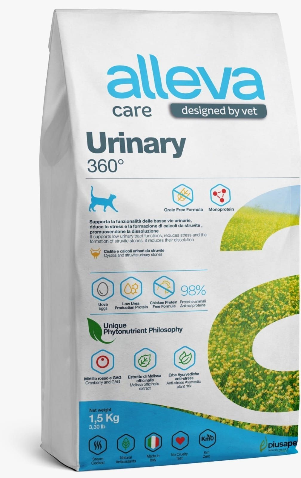 Alleva Care Urinary 360° - это полнорационный сухой диетический корм для взрослых кошек, предназначенный для растворения струвитных камней и предотвращения их рецидивов. Он также показан для поддержания здоровья мочевыводящих путей в случаях заболевания нижних отделов мочевыводящих путей кошек и кошачьего урологического синдрома.