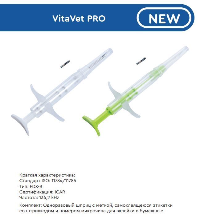 Микрочип для домашних и сельскохозяйственных животных VitaVet PRO используется для электронной идентификации животных. Подкожный микрочип состоит из приемника, передатчика и блока памяти для хранения кода.