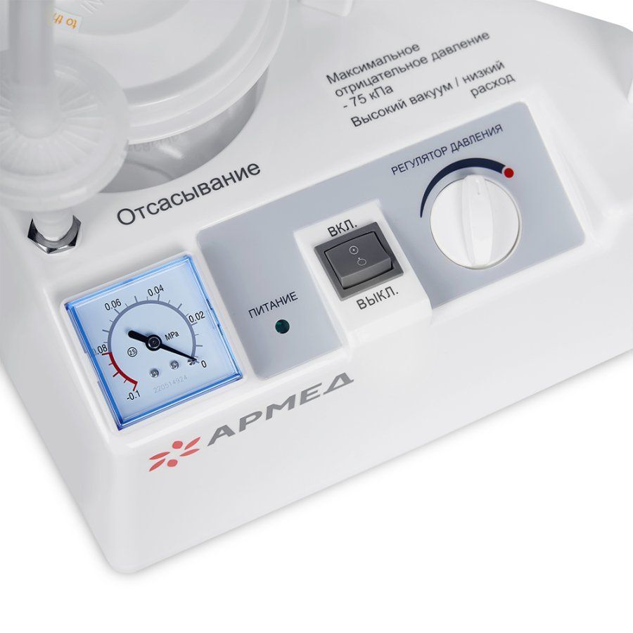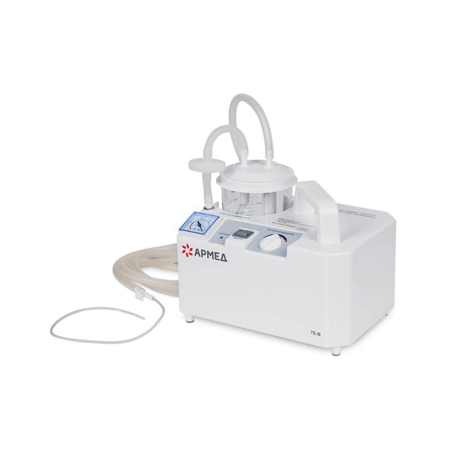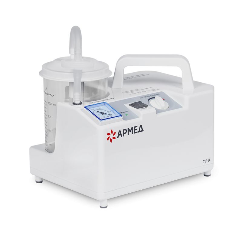 Хирургический отсасыватель Армед 7Е-В имеет небольшие габариты, поэтому его можно переносить в помещении за удобную ручку. Для включения и управления прибором предназначена одна кнопка и механический регулятор. В комплекте с оборудованием предусмотрен специальный катетер небольшого размера.