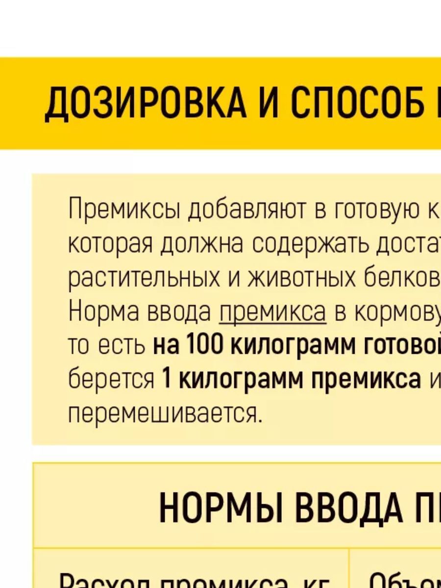 Норма ввода премикса П-60-1 для дойных коров в комбикорм — 1%, т е на одну часть премикса берется 99 частей кормовой смеси, тщательно перемешивается, а затем скармливается дойным коровам.