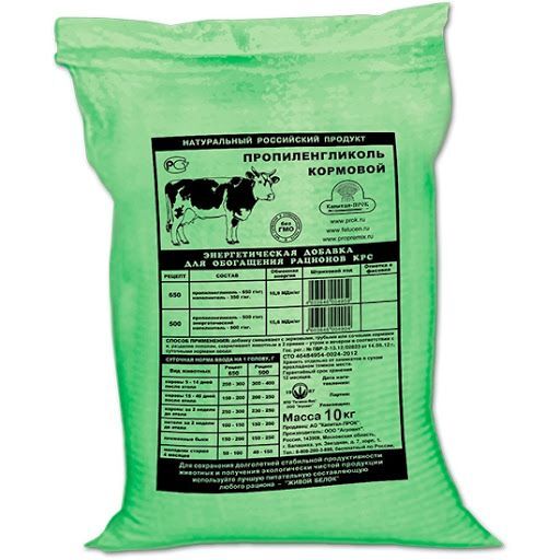 Пропиленгликоль сухой кормовой (50 %) - это макроэнергетическая добавка к основному рациону высокопродуктивных коров для профилактики нарушений обмена веществ в организме (кетоза), увеличения уровня глюкозы в крови, компенсации дефицита энергии в рационе, которая:- нормализует работу клеток печени;- увеличивает концентрацию глюкозы в крови;- быстро компенсирует дефицит энергии в организме;- профилактирует и комплексно применяется для лечения кетоза;- сокращает сервис-период, положительно влияет на оплодотворяемость;- увеличивает продуктивность;- повышает содержание жира и белка в молоке;- эффективно расходует корма за счет их лучшего усвоения;- сохраняет высокую продуктивность животных.СОСТАВ1,2-пропандиол (пропиленгликоль) – 500 г/кг, наполнитель – 500 г/кг.