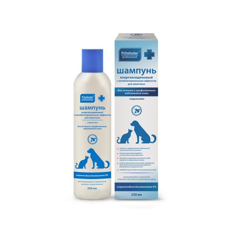 Шампунь антибактериальный с хлоргексидином для животных – лекарственное средство из серии Пчелодар, содержащее в качестве активных компонентов хлогексидина биглюконат (5%), экстракт прополиса, экстракты лекарственных трав (зверобоя, крапивы и ромашки), экстракты морских водорослей (ламинарии и фукуса), провитамин В5, а также вспомогательные компоненты.По внешнему виду представляет собой однородную гелеобразную жидкость белого цвета с запахом трав и парфюмерной отдушки.Шампунь выпускают расфасованным по 250 мл в полимерные флаконы, укупоренные крышками диск-топ, упакованные в картонные пачки в комплекте с инструкцией по применению.Шампунь с хлоргексидином для собак и кошек – лекарственное средство пролонгированного действия, предназначенное для повседневного ухода за кожно-шерстным покровом животных, для профилактики и лечения заболеваний кожи различной этиологии. Оказывает антисептическое, противобактериальное, противогрибковое, противозудное и дезодорирующее действие.Хлоргексидина биглюконат – антисептик, в зависимости от концентрации проявляет бактериостатическое или бактерицидное (в т. ч. фунгицидное) действие. Активен в отношении кокков Staphylococcus aureus, Staphylococcus epidermidis, Staphylococcus valivarius, Streptococcus viridans, Streptococcus haemolitycus, Streptococcus pneumoniae, Streptococcus mutans, Streptococcus agalactiae, Streptococcus serotypes и ribotypes, Enterococcus species, бактерий Escherichia coli, Haemophilus influenzae, Acinetobacter.Экстракты лекарственных трав, прополиса и водорослей, являясь источниками витаминов, органических кислот и микроэлементов, активно питают, оздоравливают кожу и шерсть, улучшают их структуру, обеспечивая безупречный внешний вид, упругость, мягкость и лоск. Экстракты лекарственных трав и прополиса оказывают антибактериальное и антимикотическое действие, снимают воспаление, раздражение и зуд на пораженных участках кожи, способствуют устранению неприятного специфического запаха животного.Провитамин В5 (D-пантенол) восстанавливает барьерную структуру эпидермиса при любых поражениях: трещинах, дерматитах и ожогах, препятствует излишней линьке и предохраняет кожу от пересыхания и шелушения. Обеспечивает нормализацию водно-липидного обмена и глубокое увлажнение шерстного покрова животного.При нанесении на кожно-шерстный покров животного во время мытья активные компоненты средства оказывают кратковременное контактное действие в отношении микроорганизмов в местах их локализации, а после всасывания - длительное системное дезинфицирующее и дезодорирующее действие.Шампунь по степени воздействия на организм относится к малоопасным веществам (4 класс опасности по ГОСТ 12.1.007-76), при нанесении на кожу в рекомендуемых дозах не оказывает местно-раздражающего, резорбтивно-токсического и сенсибилизирующего действия.
