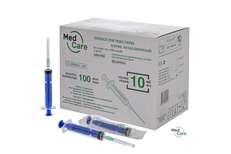 Шприц 10мл инъекционный однократного применения, трехкомпонентный, с иглой 0,8х40мм (21Gх1 ½"), торговая марка MedCare