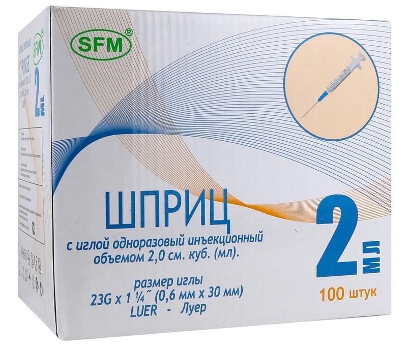 Шприц 2 мл двухкомпонентный с надетой иглой 0,6 х 30 - 23G SFM 100 штук.