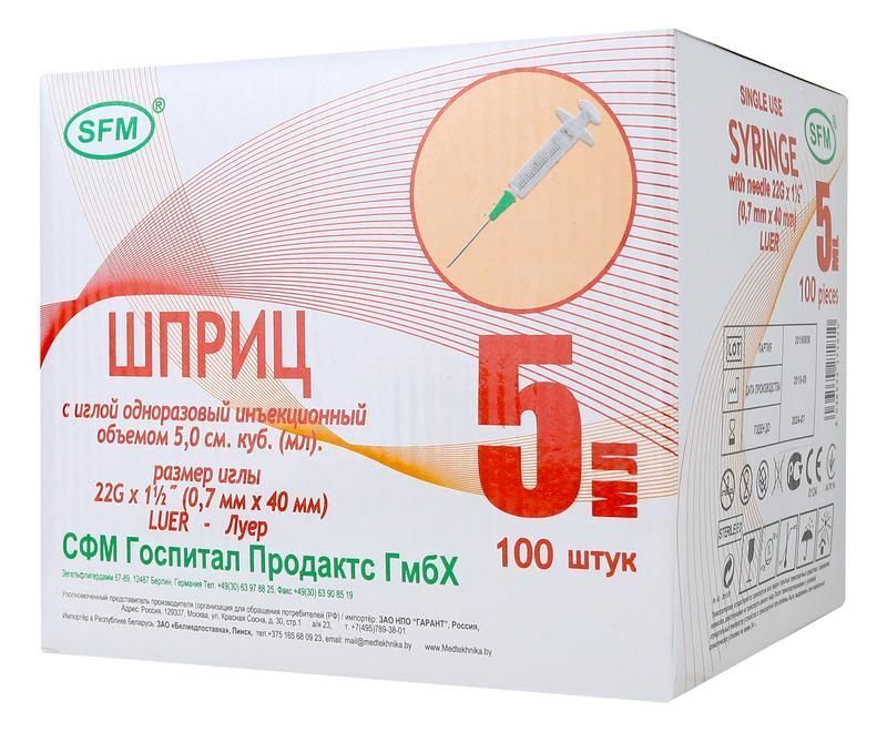 Шприц 5 мл двухкомпонентный с надетой иглой 0,7 х 40 - 22G SFM 100 штук.