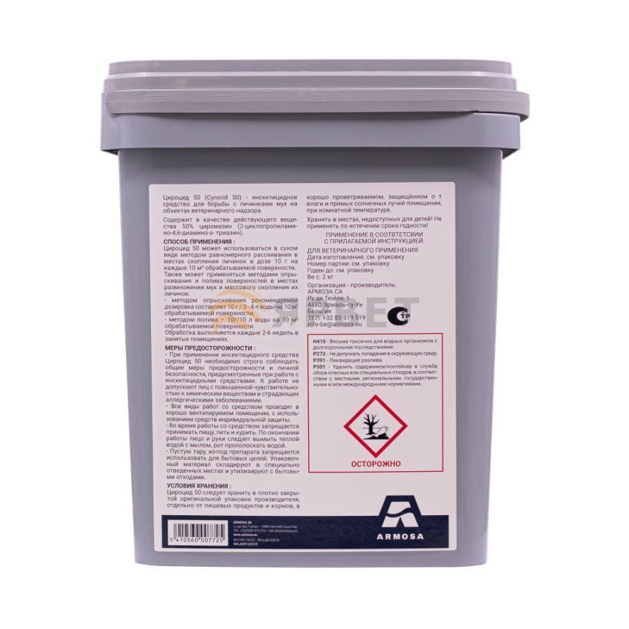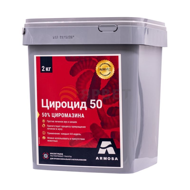 Инсектицидное средство для борьбы с личинками мух на объектах ветеринарного надзора. Содержит в качестве действующего вещества 50% циромазин (2-циклопропиламино-4,6-диамино-s- триазин).