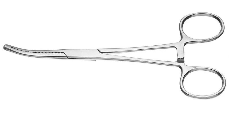 Зажим кровоостанавливающий изогнутый 1*2 зубый, зубчатый, №1, 150 мм имеет узкие и длинные рабочие бранши. Бранши заканчиваются острыми зубцами. Зубец одной бранши входит между двумя зубцами второй бранши. Это травмирует ткань, но при этом надёжно её удерживает.